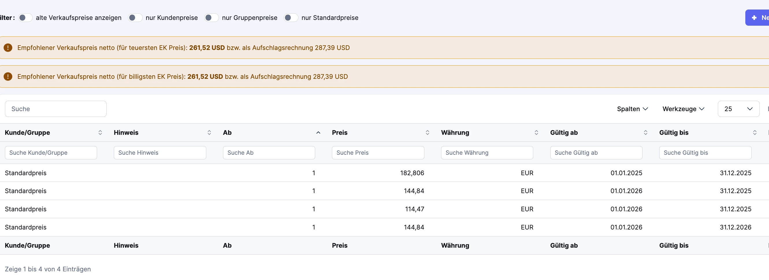 Es ist ziemlich problematisch, dass man mehrere gleichzeitig aktive EK / VK Preise der gleichen Art haben kann.
