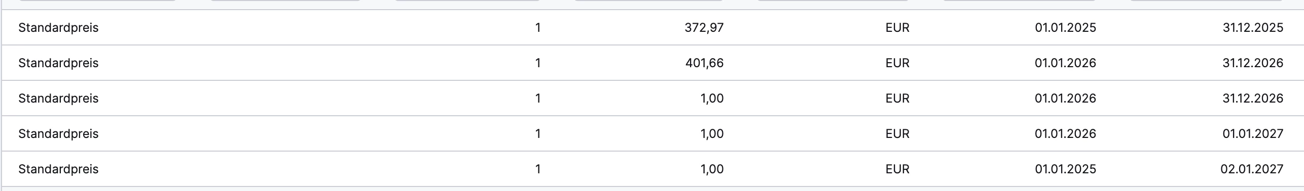 Dazu habe ich ein Bild angehangen. Es sind alles Standardpreise, mit teils unterschiedlichen, teils gleichen Start / Enddaten - keine Gruppen oder Kundenpreise.