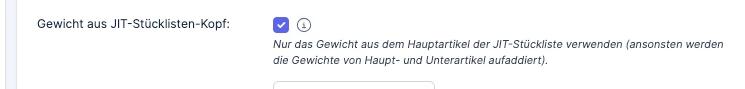 2. Gewichte auf JIT Kopfebene nur wenn Ihr etwas über die Komponenten hinaus speziell für dieses Bundle gewichtsmäßig berücksichtigen wollt. Ansonsten Kopfartikel = Gewicht 0.