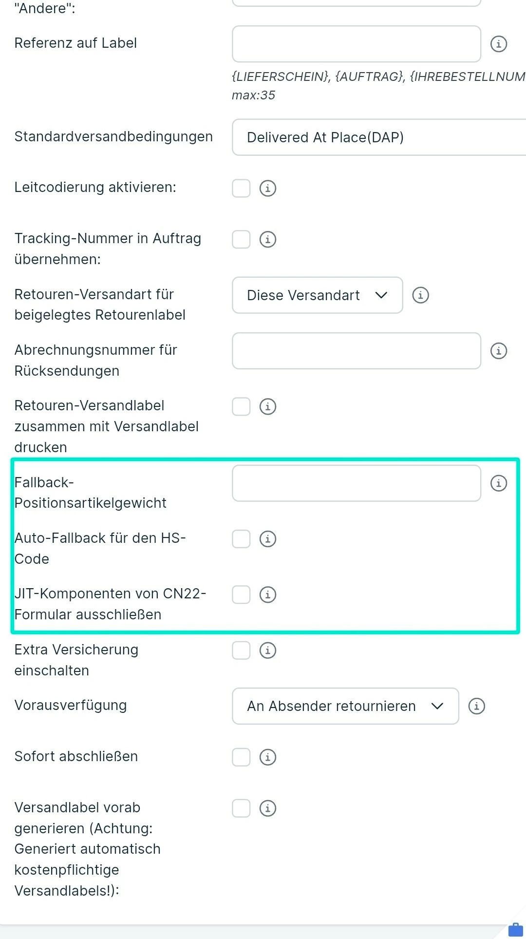 Behelfsweise könnt Ihr die nachfolgenden Optionen in den Experten-Einstellungen der neuen "dhl" Versandart verwenden.