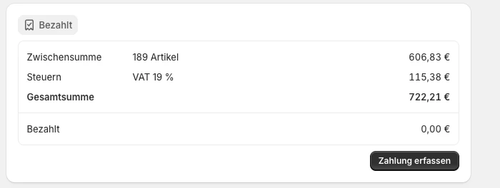 Grundsätzlich sollten die beiden Punkte (Gesamtbetrag festsetzen (aktiv) + Maximale Differenz zum berechneten Gesamtbetrag (Wert = 1)), soweit wir das verstehen, die Berechnung aus Shopify übernehmen, sodass die Daten konsistent sind, aber das passiert nicht.